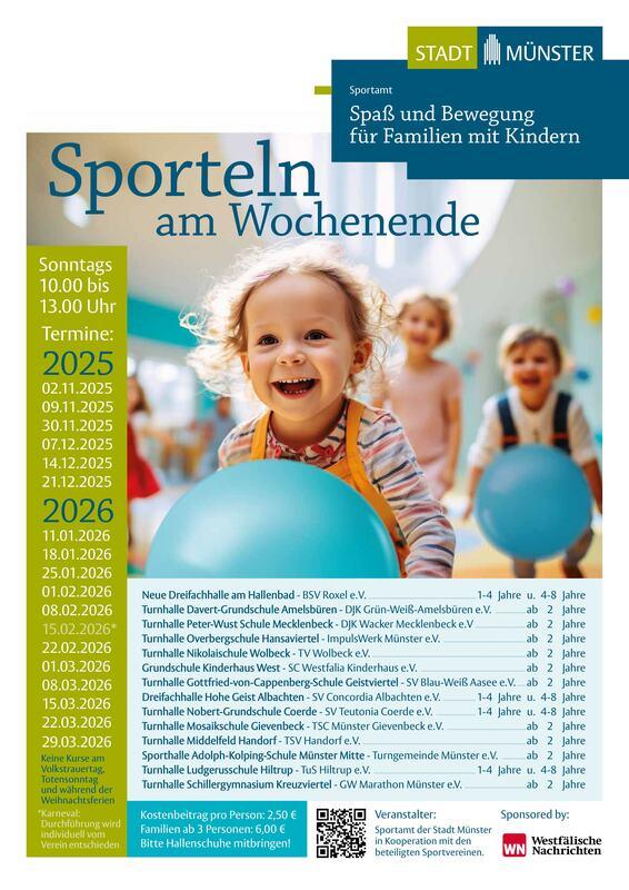 Vom 2. November 2025 bis zum 29. März 2026 kann wieder jeden Sonntag gesportelt werden: Bewegungsfreudige Familien mit Kindern bis acht Jahren können sich an Schaukeln, Ringen und Matten in zwölf Sporthallen im Stadtgebiet austoben. „Sporteln am Wochenende“ findet immer sonntags von 10 bis 13 Uhr statt. Am 16. November (Volkstrauertag) und 23. November (Totensonntag) sowie in den Weihnachtsferien fällt das Sporteln aus. Die Aktion ist ein gemeinsames Angebot der beteiligten Sportvereine und des Sportamtes.